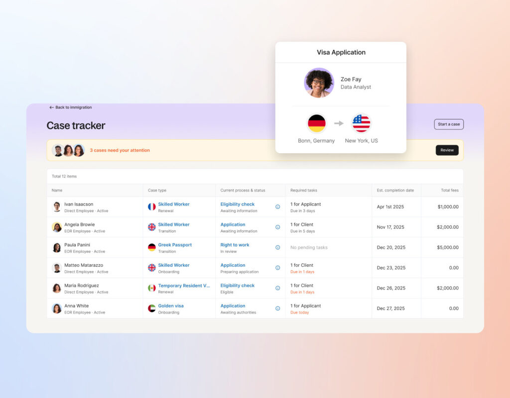 Geïntegreerd in het Deel HRIS stelt het platform teams in staat om visumaanvragen te volgen, meldingen te ontvangen bij vervaldata en diensten te starten en dit voor zowel korte zakenreizen tot als permanente relocatie in meer dan 100 landen, ondersteund door interne mobiliteitsexperts.